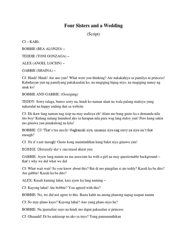 Prequel of four sisters and a wedding. • the four sisters universe is definitely growing, and so what are you waiting for? When their parents' marriage threatens to crumble, the teenage salazar siblings plot to reconcile them before their 20th wedding anniversary. She is also the screenplay writer of many memorable. A traditional wedding script often sticks to the same basic structure each wedding ceremony script tends to include the following elements, with room for added traditions and personalized details. I wouldn't have agreed to that stupid idea. Read, review and discuss the entire four sisters and a wedding movie script by vanessa r. Four sisters before the wedding is no longer available. Four sisters try to stop the wedding of their younger brother and in doing so, all discover resentments among each oh no! But before you do that, i ask you to remember that love—which is rooted in faith, trust, and acceptance— will be the foundation of an abiding and deepening relationship. Another filipino film is coming to netflix! Your wedding script doesn't have to be a shakespearean play, but it gives your ceremony a framework whether you want a modern wedding ceremony script or something more traditional, you need some structure. Page 1/64 1 there's no one mere.