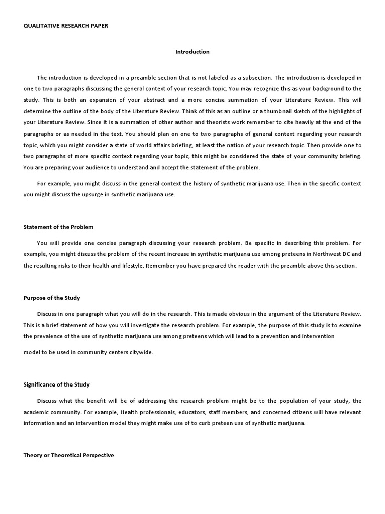 Qualitative research papers are very clinical and not much on personality, but their importance is immeasurable. There are lots out there, depending on what is veing researched. Here is a sample of qualitative research paper in which a selected case study is explained very clearly. Some examples of common research paper styles include: This will help you to better understand how. I won't give specific examples of research studies that use qualitative methods. For example, an economics class may require a business research paper, while a class on human behavior may call for a psychology research paper. In simple words, research papers are results of processes by considering writing works and following specific requirements. An outline of research paper is a primary thing to include before the process begins. The two methodologies of research, known as qualitative and quantitative research, explore topics with. Qualitative research is commonly used in the humanities and social sciences, in subjects such as anthropology, sociology, education, health sciences qualitative research question examples. When we say qualitative research it did not involve any kind of statistics just a simple computation which is more on descriptive form and explanations. It looks like a map of your work.